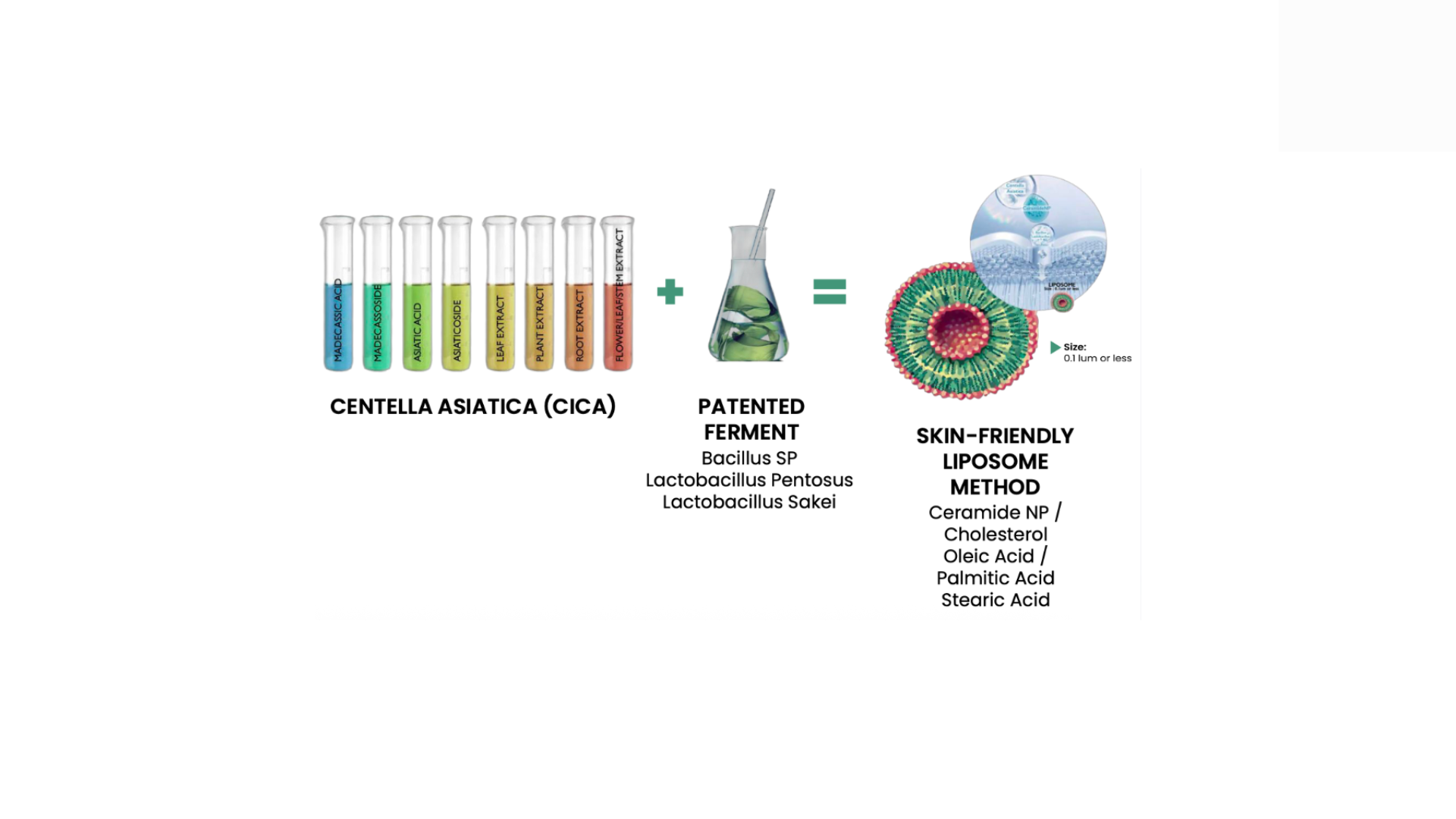 Our new collection is powered by 8 types of CICA and patented fermented stain, nano-processed into ultra-fine liposomes that penetrate deeper.