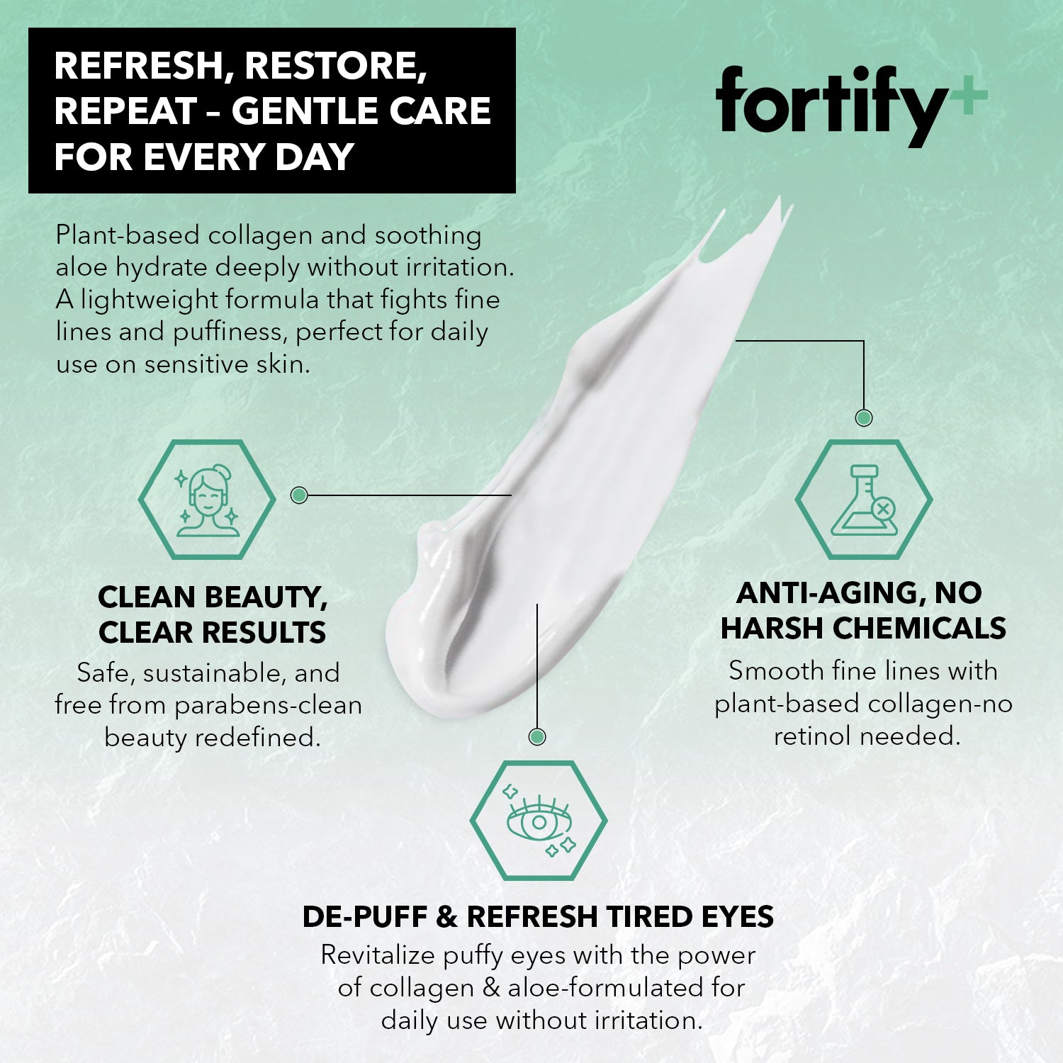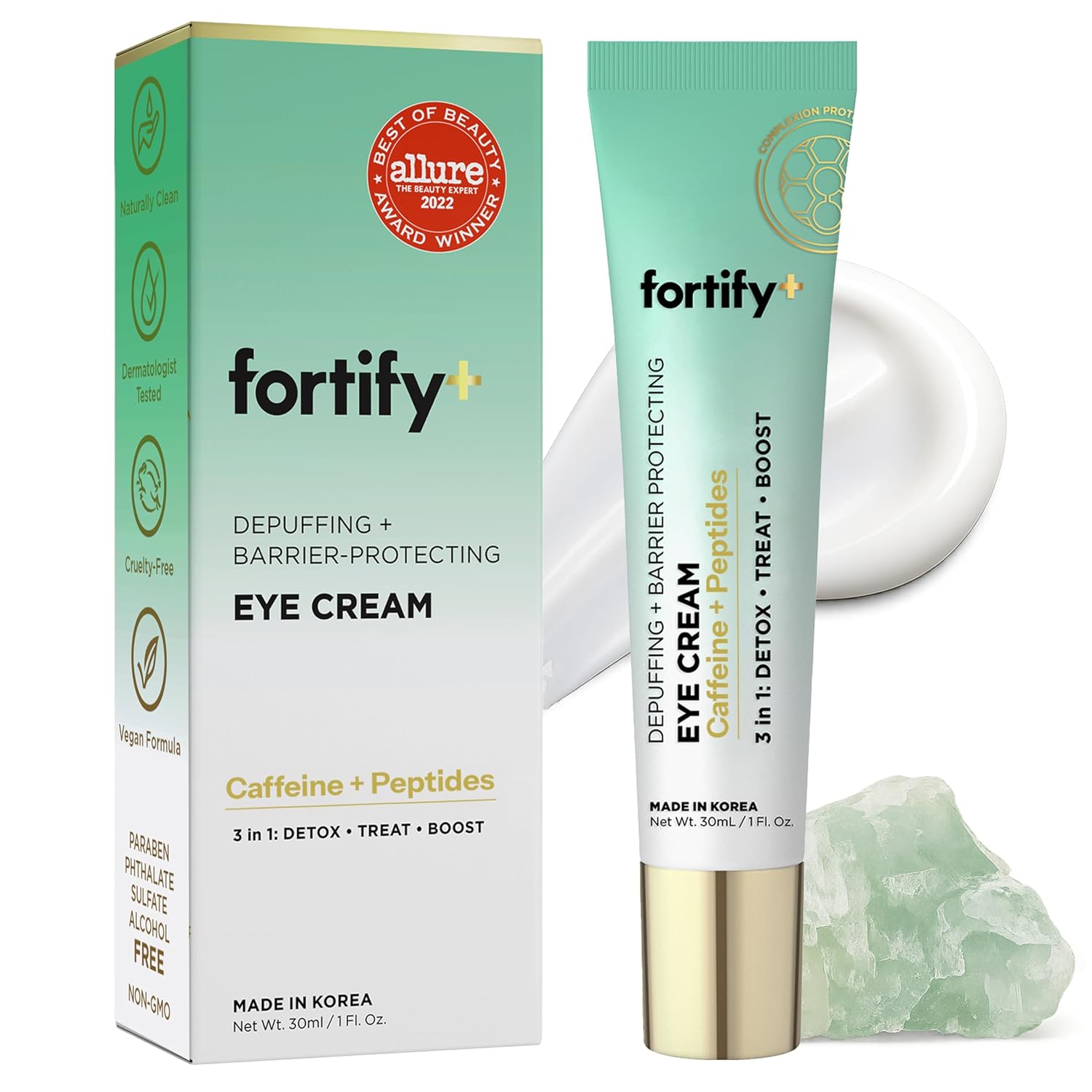 Suitable for use in both AM and PM skincare routines, FORTIFY+ De-Puffing + Protecting Eye Cream helps repair, protect, and rejuvenate eyes for a fresher, more awake, more energized appearance.