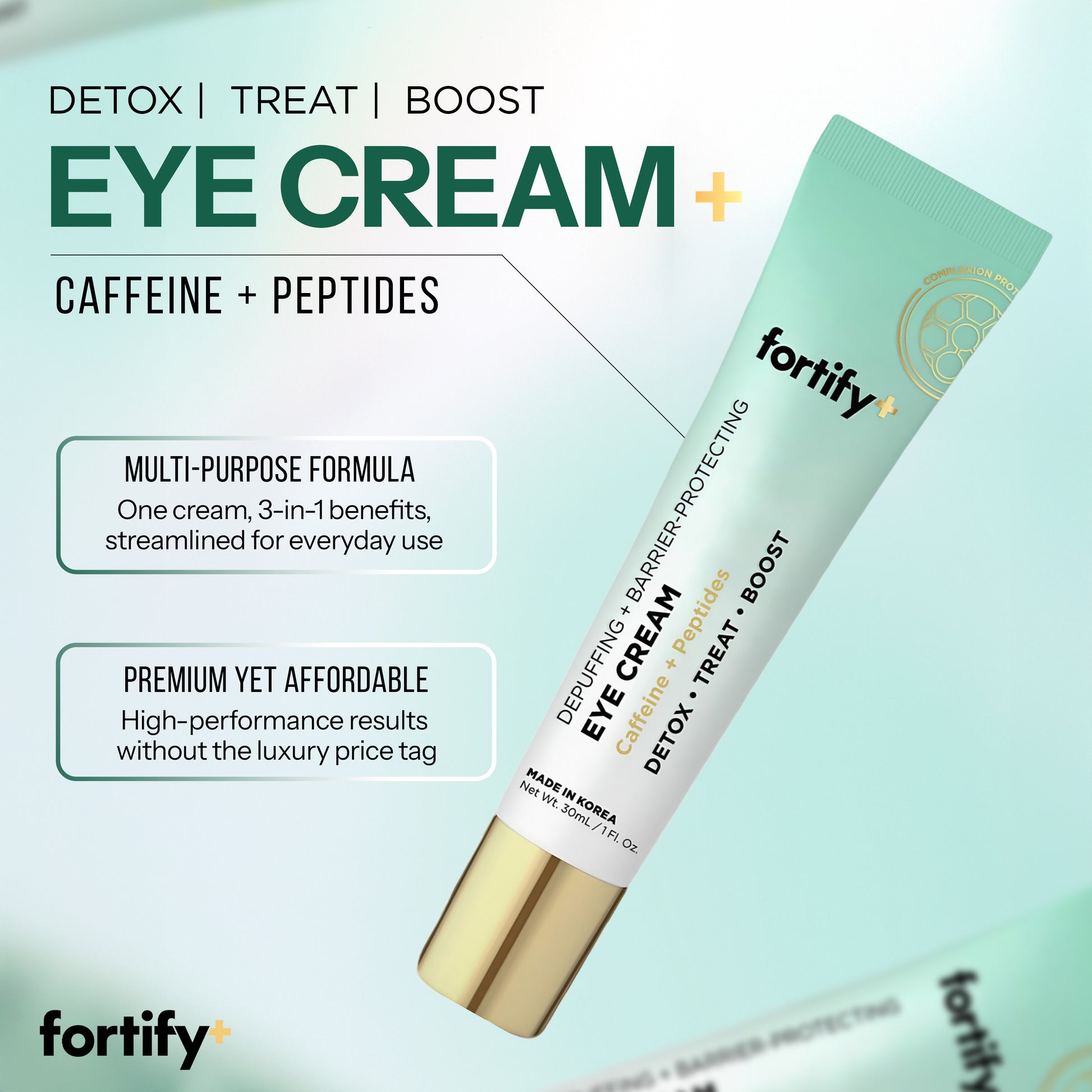 Suitable for use in both AM and PM skincare routines, FORTIFY+ De-Puffing + Protecting Eye Cream helps repair, protect, and rejuvenate eyes for a fresher, more awake, more energized appearance.