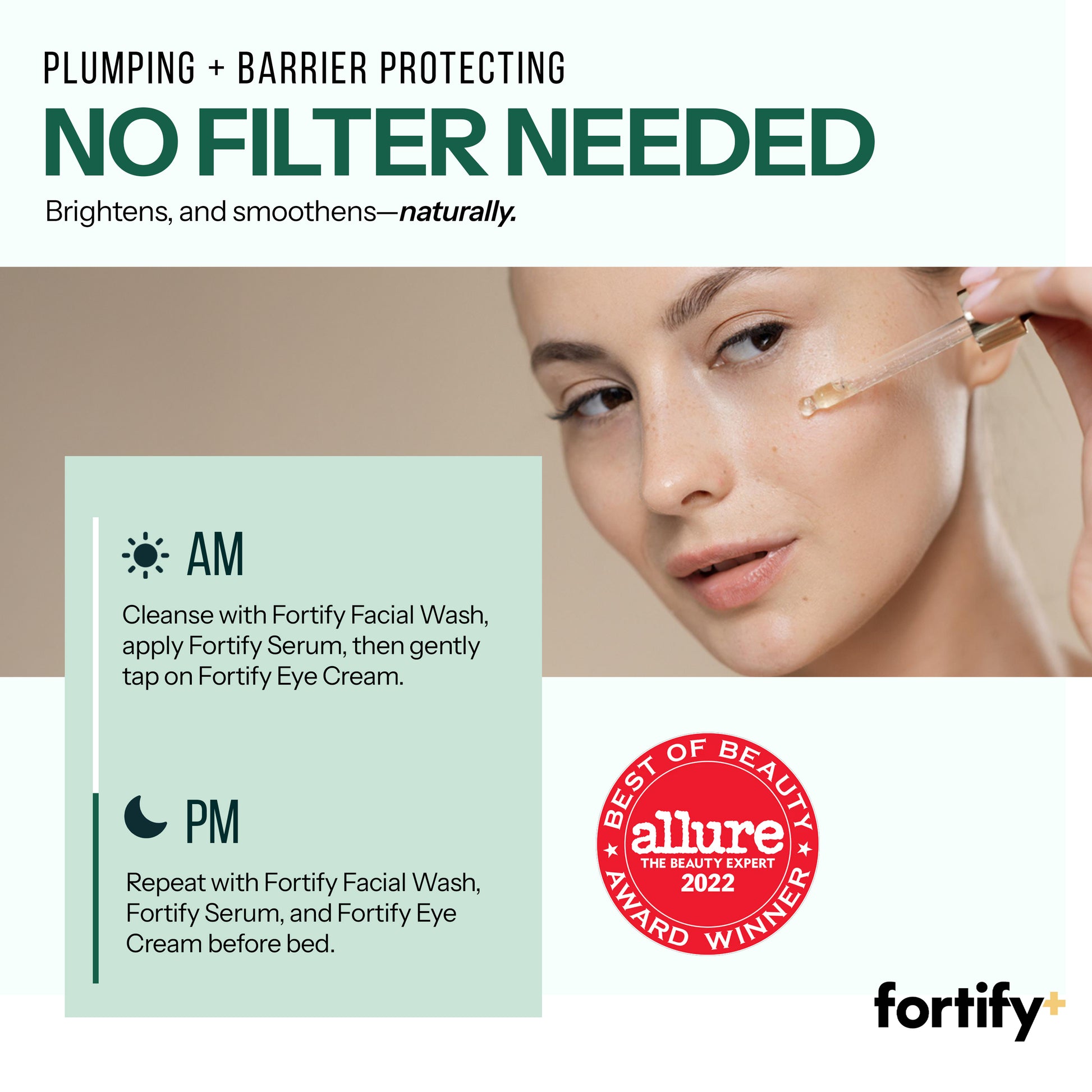 FORTIFY+ Moisturizing + Protecting Facial Serum brings instant rejuvenation and protection to skin suffering from dehydration, dryness and irritation.